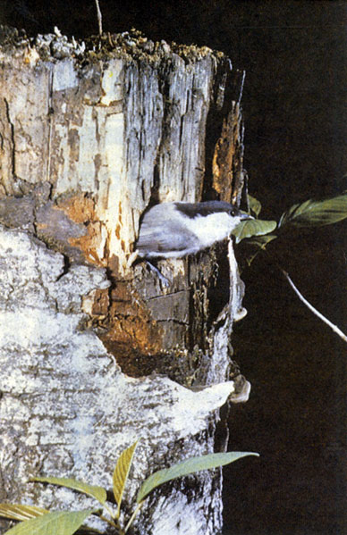 Дела задержали меня в Москве на целых две недели. И вот вновь подхожу к пеньку. Птиц разных вокруг много, но гаичек не слышно и не видно. Должно быть, зря я старался... Гляжу в леток - ничего не видно, сплошная темнотища. Подул внутрь - и чуть не подскочил от радости! Зашипела! Гаичка зашипела!!!