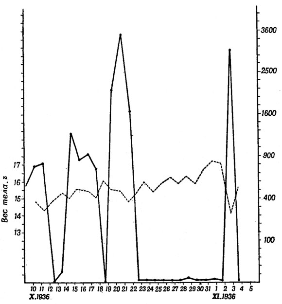 Рис. 43. Зависимость между перелетным беспокойством и весом тела у серой славки (Sylvia с. communis Lath.) (Из Меркеля, 1940.) — перелетное беспокойство; --- вес тела